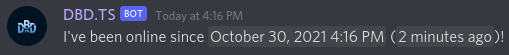 code: `I've been online since <t:$round[$divide[$readyTimestamp;1000];0]:f> (<t:$round[$divide[$readyTimestamp;1000];0]:R>)!`